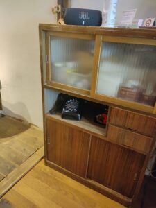 - レトロな町家リノベの空間。黒電話やアンティーク小物がさりげなく置かれ、時間がゆっくり。