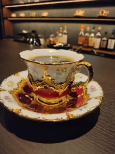 こちらでは、マイセンやセーヴルなど(取扱は要確認)の美しいカップで珈琲をいただけるのが特徴。わずかに重みのある器は手にすっと収まり、口当たりまで変えてくれるから不思議。アイスコーヒーのグラス(ボウル)も、暗めの灯りに模様が浮かび上がって綺麗。器好きにはたまらない時間です。